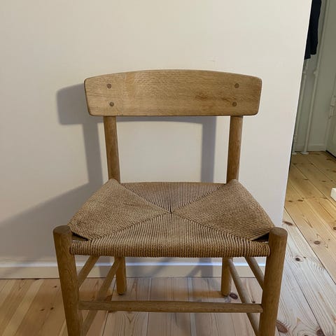 Begge er helt faste i samlingerne og med nyere flet, som man stadig sidder godt på. Men det er let at få lavet ny flet, hvis det skal stå helt skarpt. Den ene har en svag plet på fletten fra rød neglelak.