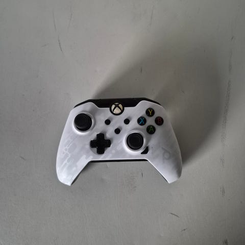 Xbox One controller i hvid. Trådløs håndkontrol med standard knaplayout, to analoge styrepinde, styrekors og skulderknapper. Egnet til brug med Xbox One konsol, PC og andre kompatible enheder, afhængigt af opsætning og tilslutningsmuligheder.