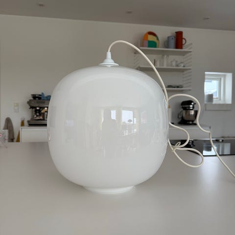 Smuk vintage pendel i opalglas. Krom besætning og aflastning. Monteret med klar ledning og E27 fatning. Opalglas spreder lyset smukt. Flot loftlampe og spisebordslampe.