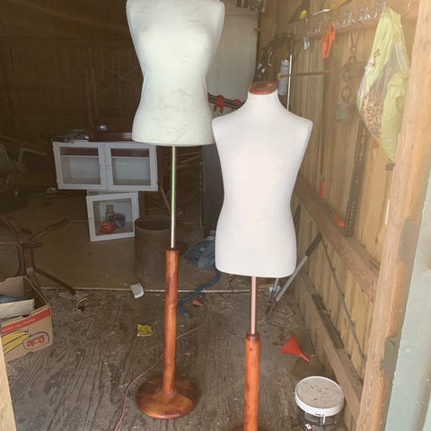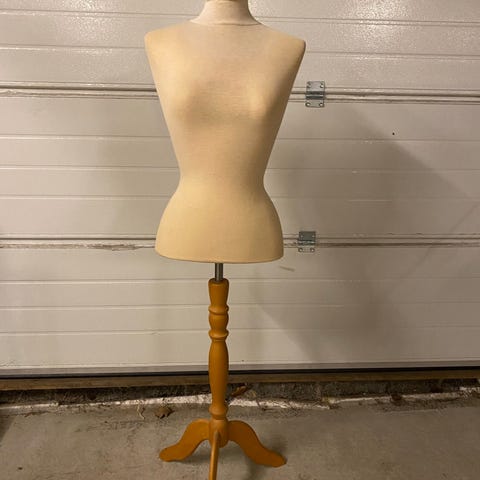 Dame giner på træfod i hvid. Ginen har formet overkrop uden arme og hoved og er monteret på en trefod i træ. Egnet til fremvisning af tøj, kjoler, jakker eller til brug i systue og til tilretning af beklædning. Træfoden har synlige brugsspor og reparationer, som fremgår af billederne.