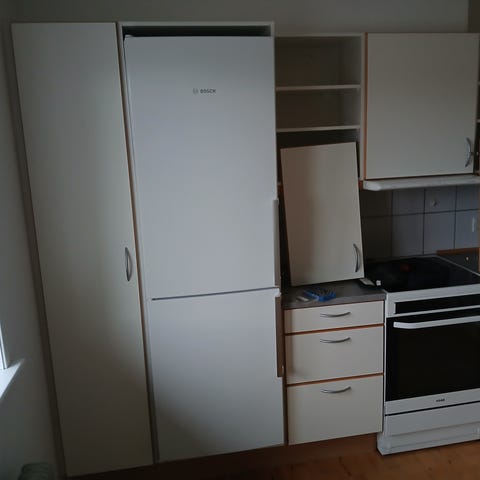 Der skal laves sokkel til køkkenet, da denne ikke medfølger - der er heller ikke ben til.