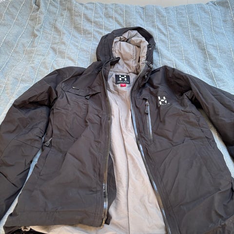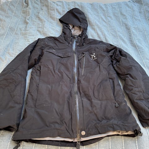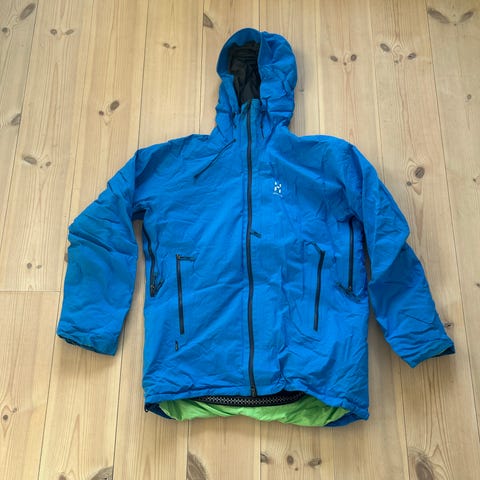 Haglöfs ski-jakke i grøn farve. Jakken har hætte og liftkort lomme. Indersiden har snefang.