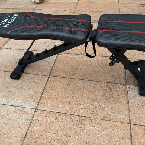 Foldbar bænk af mærket Odin. Ryglænet kan foldes op, så det ikke fylder meget.