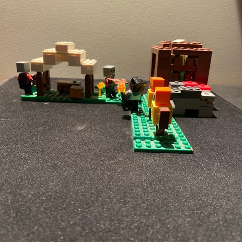 LEGO Minecraft byggesæt. Sættet består af klodser i flere farver, der kan samles til en Minecraft-inspireret scene med bygninger, tårn og terræn. Der medfølger flere figurer og væsner fra Minecraft-universet samt forskellige tilbehørsdele som våben og blokke. Egnet til børn, der kan lide at bygge og lege med LEGO og Minecraft-motiver.