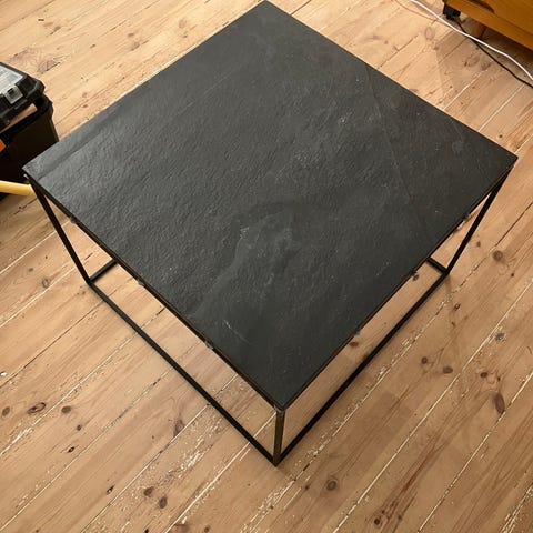 Sofabord med sort stål stel og sort granit/stenplade sælges. Det er meget robust.
