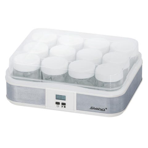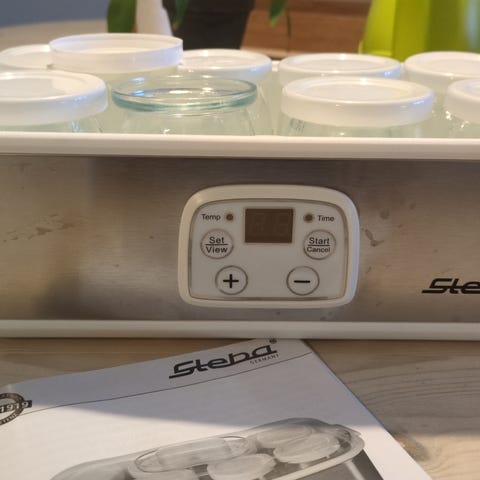 Steba Yoghurt maskine / inkubator som kan bruges til at lave frisk yoghurt. Er stort set ubrugt. Inklusive tilhørende bægere til yoghurt. Tid kan reguleres op til 15 timer. Maskinen er med timerfunktion, LCD display og plads til 12 medfølgende bægere.