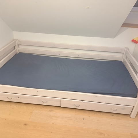 Fin Flexa seng hvid bejdset. Ben og lige stige så den kan komme op i højden medfølger. Enkelte brugsspor.