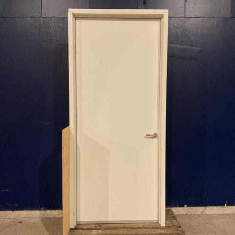 Indvendig dør i lyst træ. Døren har hængsel i siden og er egnet til brug indendørs,