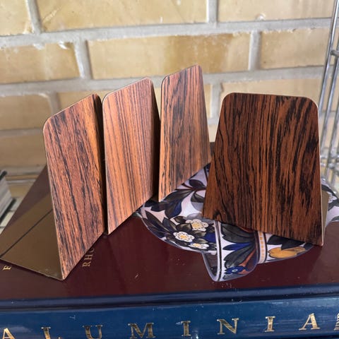 7 bogstøtter i metal med teaktræ-look