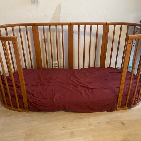 Stokke juniorseng i hvidmalet træ. Sengen er rund/oval med tremmer hele vejen rundt og står på hjul, så den er let at flytte. Den er egnet som juniorseng til mindre børn. På billederne ses en hvid sengehimmel og sengekant, som kan bruges til at skabe afskærmning omkring barnet. Sengen har synlige brugsspor på kanten, som fremgår af billederne.