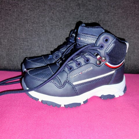 Tommy Hilfiger støvler til børn, pigemodel i str. 36. Støvlerne er sorte med skinnende overflade og snørelukning foran samt lynlås i siden for nem af- og påtagning. Overdelen er i syntetisk materiale, og sålen er i gummi med mønster for bedre fodfæste. Bagpå er der strop med Tommy Hilfiger-striber og lille logo-detalje på siden.