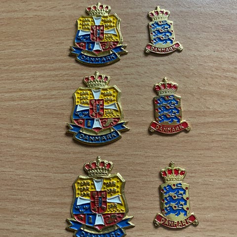 Sæt med metalemblemer bestående af to kroner og to monogrammer med bogstavet M i ornamenteret design. Emblemerne er udført i metal og egner sig til montering på f.eks. uniformer, tasker, kasser eller som dekoration på andre genstande.