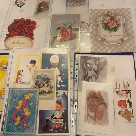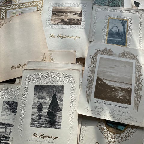 Blandet parti gamle kort og telegrammer med forskellige motiver. Kortene omfatter blandt andet gratulationskort, fødselsdagskort og telegrammer med blomster, landskaber og andre trykte illustrationer. Flere kort er håndskrevne og daterede, og nogle har dekorerede kanter eller prægede detaljer. Egner sig til samling, scrapbooking eller kreativ brug, hvor originale ældre papirtryk ønskes bevaret eller genanvendt.