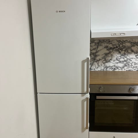 Bosch køle-fryseskab i fritstående model med køl øverst og fryser nederst. Front i rustfrit stål med separate håndtag til køle- og frysedel. Egnet til placering i køkken eller bryggers til opbevaring af dagligvarer og frostvarer. Nærmere modelbetegnelse, energiklasse, mål og volumen er ikke oplyst. Er overtaget i forbindelse med lejlighedskøb så ved ikke hvornår det er fra.