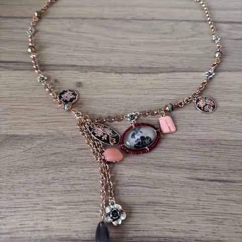 Halskæde til kvinde. Vedhænget har en bladformet detalje med gyldent skær og er monteret på en enkel kæde. Smykket er egnet til daglig brug eller som enkel pynt til mere formelle anledninger.