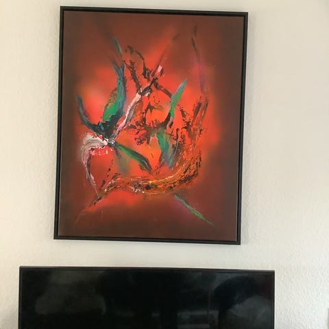 Abstrakt maleri sæt vægkunst i flere dele. Motivet består af organiske, grønne og røde former på lys baggrund, fordelt på fem separate lærreder i forskellige størrelser. Egnet som vægdekoration i stue, kontor eller andre opholdsrum, hvor man ønsker et samlet kunstudtryk fordelt over en større vægflade.