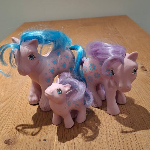 My Little Pony (G1) Loving Family Ponies Sweet Celebrations set - Mommy, Daddy & Baby Sister Sweet Celebrations. Udgivet i 1984, 1986 og 1987 og igen som samlet boxset i 1988. Sælges samlet for prisen. Se også mine andre annoncer for andet retro legetøj.