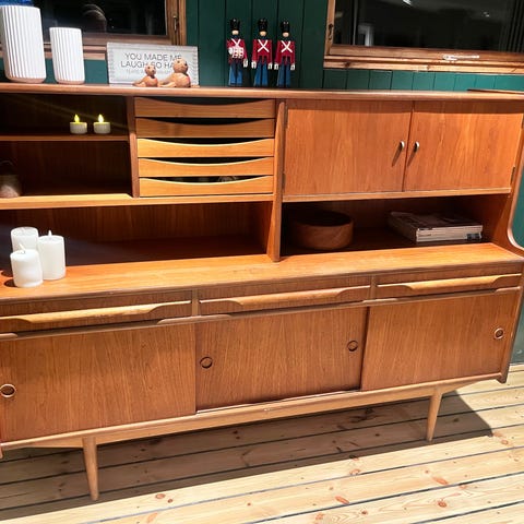 Lækker skænk i teak med syv skuffer i hvid og et rum med låge. Koniske skråtstillede ben i teaktræ.