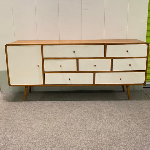 Lækker skænk i teak med syv skuffer i hvid og et rum med låge. Koniske skråtstillede ben i teaktræ. Fremstår i super stand. Evt kan lev aftales.