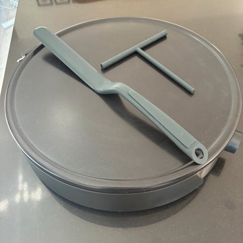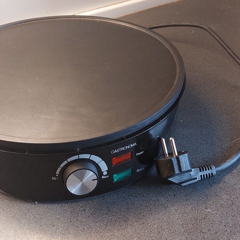 Jeg er åbenbart så gammeldags at en almindelig pandekage-pande er mere mig. Så den søde tanke min mand havde forrige år har stået i skabet siden jeg prøvede at bruge den en enkelt gang. Det er synd for den er sikkert rigtigt god for den der har det rigtige sving i håndleddet til at dreje fordelings-redskabet, dette og paletten er købt seperat for 199,- men følger med i prisen her.