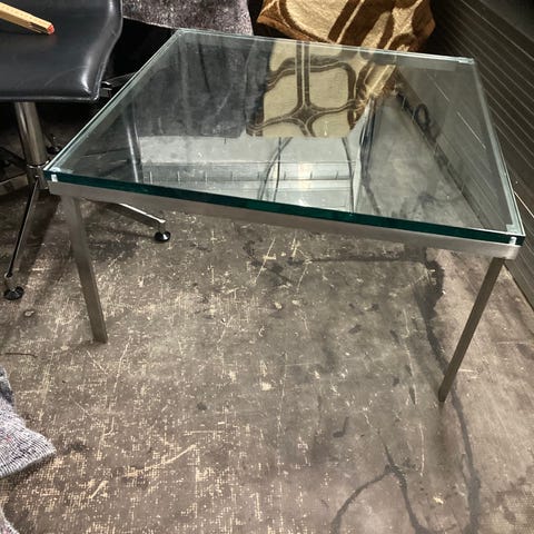 &Tradition sidebord med rund glasplade og metalstel. Bordet har en transparent glasbordplade og et geometrisk metalunderstel i en lys metallisk farve. Egnet som sidebord ved sofa eller lænestol, eller som lille afsætningsbord i stue eller entré.