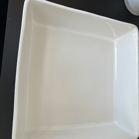 Firkantet fad i hvid. Fadet har håndtag i den ene ende og er egnet til brug i køkkenet til fx ovnretter, servering eller opbevaring af mad. Materiale, præcise mål og kapacitet er ikke oplyst.