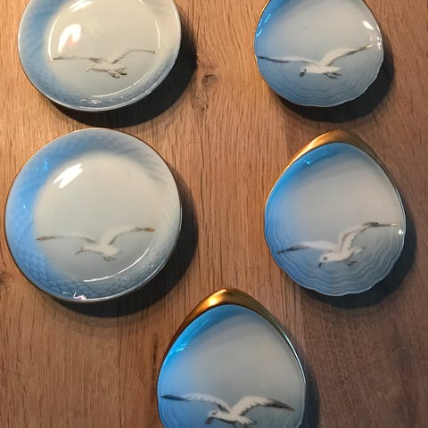 Asietten er formet som et blad med en håndmalet måge og blå skælkanter.