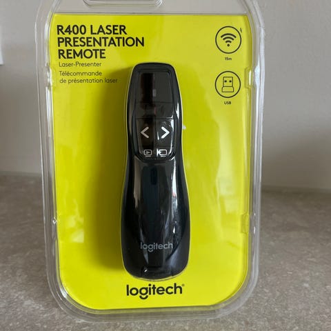 Logitech R400 laser præsentationsfjernbetjening i sort. Trådløs fjernbetjening til præsentationer med integreret rød laserpeger. Enheden har navigationsknapper til skift af slides samt tænd/sluk-knap. Kompatibel med Windows, ifølge emballagens angivelse. Velegnet til brug med projektor eller skærm ved præsentationer, foredrag og møder.
