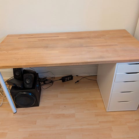 Skrivebordet har en lys træfinish med metalramme og hjul til nem transport.