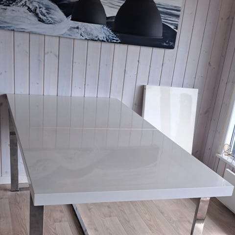 Møbel et er en hvid bordplade med en skuffe og ben i lyst træ, moderne design.