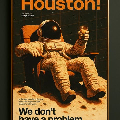 Operaen fortolker den berømte sætning 'Houston, we have a problem' og gør den til en ironisk og distanceret erklæring: der er slet ingen problemer, kun mental fred og kosmisk stilhed.