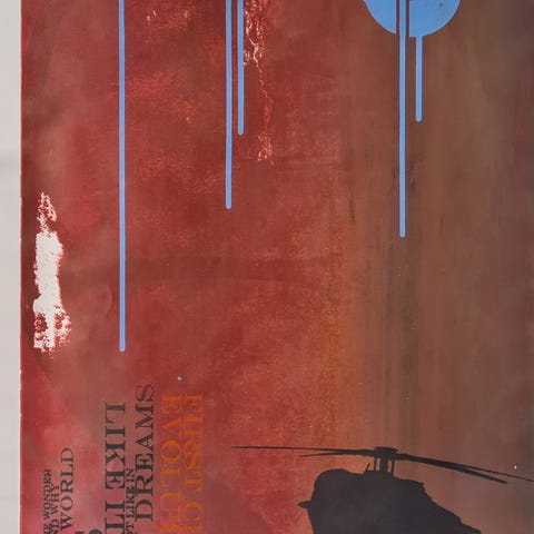 Kunstværket er dristigt og dystopisk: kæmpe robotfigurer dominerer et stiliseret bylandskab, gengivet i en iøjnefaldende orange- og sort palet. Futuristisk infrastruktur, overdreven skala og tegneserie-præcision giver billedet en grafisk, næsten sci-fi kvalitet.