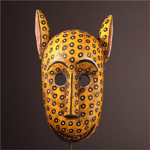 Bwa-maske i polykromt træ med en halvslidt patina. Medfølger den originale hætte af flettet plantefiber. Højde 42 cm, inklusive hætte. Stammer fra en gammel italiensk samling.
