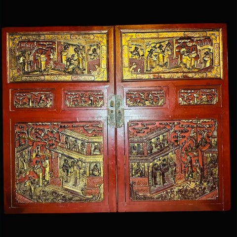 Antik håndhugget kinesisk træpanel fra tidligt til midten af det 20. århundrede, forgyldt og malet