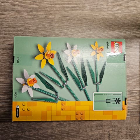 LEGO påskeliljer byggesæt. Sættet består af klodser til at bygge flere stiliserede påskeliljer med grønne stilke og blade samt blomster i gule, orange og lyserøde nuancer. Egnet som dekorativt byggesæt og som del af en større LEGO blomster- eller indretningssamling.