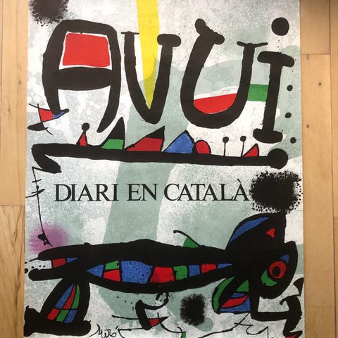 Ældre plakat, der forestiller Personnage foran solen, et ikonisk motiv i Joan Mirós surrealistiske univers – en af det tyvende århundredes mest indflydelsesrige kunstnere.