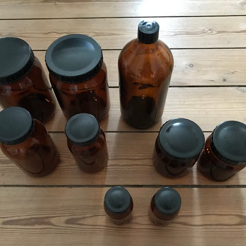 Antikke/styliserede apoteksglasflasker – sæt af 4