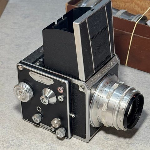 Schneider Kreuznach 5,6/105mm 1:12 /185. Diameteren af linsens ring/tråd er 25 mm. Objektivet er i fremragende stand. Slutertiderne lyder til at være i orden.