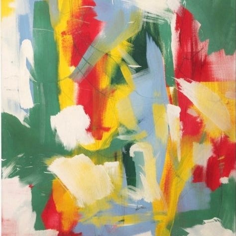 Værket byder på en ekspressiv og intuitiv komposition, der forener markante røde og blå former med spontane sprøjt og gesturale mærker på en hvid papirgrund. Den dynamiske placering af farve og bevægelse giver værket en stærk visuel rytme og en umiddelbar følelsesmæssig tilstedeværelse, karakteristisk for moderne abstrakt praksis.
