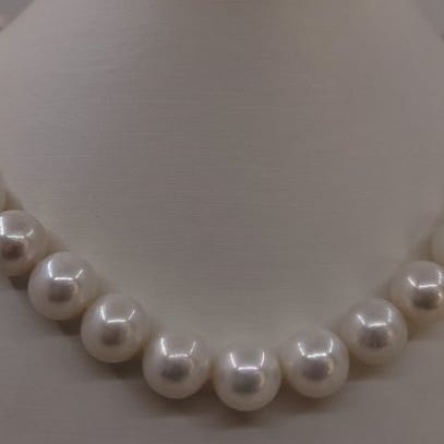 Enestående smuk freshwater kultiveret perlekæde i rund form fra Ø 10 til 11,3 mm med en usynlig 14K hvidguld lås med stempler. Trådet med silke tråd med knuder mellem hver perle. Total længde 96 cm.