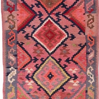 Håndvævet Anatolisk Kelim-tæppe fra Türkiye, model Anatolian, 134 cm x 70 cm, uld på uld, flerfarvet, midten af det 20. århundrede, generelt i god stand med spor af ældning og brug, professionelt rengjort. Klik på den blå "gå til varen" knap, for at købe eller byde på denne vare. Den samlede pris vil blive vist inden du afgiver dit bud.