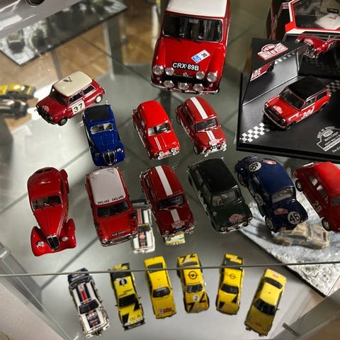 5 små figurer af Ayrton Senna i et vitrineskab.