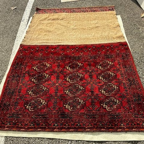 Genstanden er i fremragende stand, men der mangler et par fletninger, og der er lidt slitage på de lange frynser, som findes mellem de to kanter af tæppet (se sidste billede).