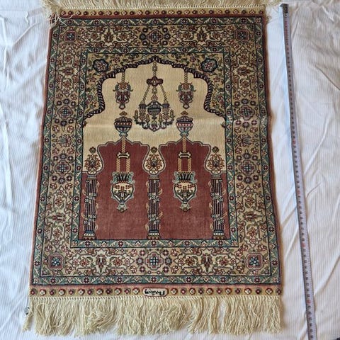 Tyrkiet, Anatolien. Håndvævet antikt bønnetæppe (seccade) fra begyndelsen af det 20. århundrede, 195 × 123 cm, uld over bomuld, i rødt, orange og beige, i god antik tilstand og professionelt renset. Klik på den blå "gå til varen" knap, for at købe eller byde på denne vare. Den samlede pris vil blive vist inden du afgiver dit bud.