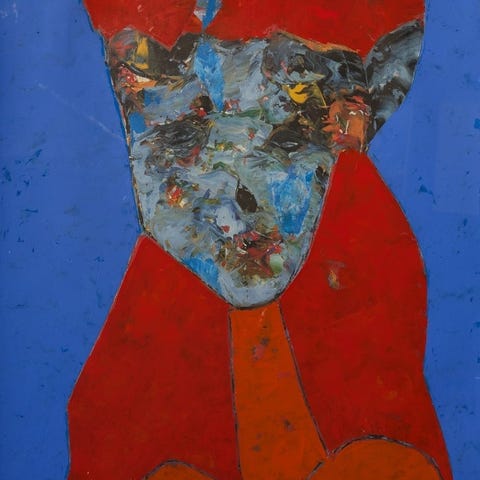 Værket præsenterer et af Jiří Kolářs berømte opdelte portrætter, opbygget gennem en vandret scanning af billedet, der fragmenterer og rekonstruerer ansigtet i en rytmisk sekvens af farvbånd. Den spejlduplikation forstærker følelsen af visuel fremmedgørelse, typisk for kunstnerens forskning, der arbejder med begreberne perception, identitet og hukommelse gennem collage og fotografisk manipulation.