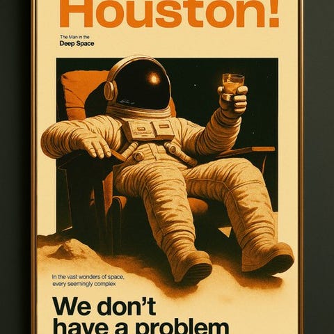 Operaen fortolker den berømte sætning 'Houston, we have a problem' og gør den til en ironisk og distanceret erklæring: der er slet ingen problemer, kun mental fred og kosmisk stilhed.