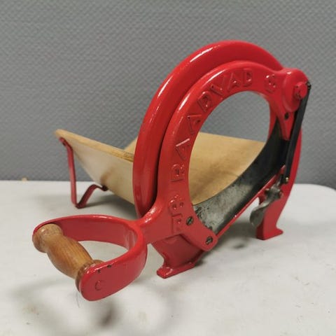 Et ikon i klassisk stil, den danske brødskærer fra RAADVAD. Denne brune model formodes at være fra 1970’erne. I fin fungerende stand. Mærket Raadvad og 294 (modelnummer). Kun få brugsspor.