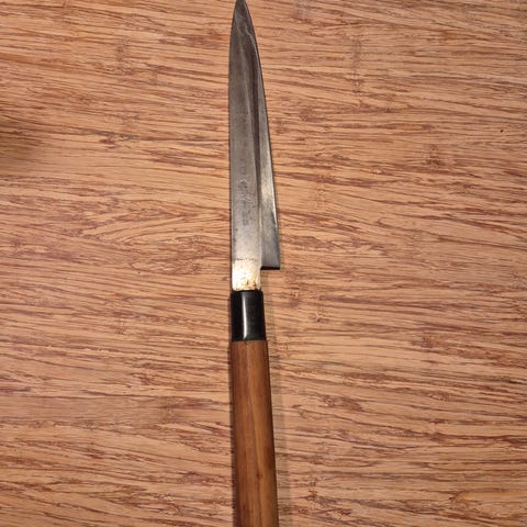 Materialer: Blade = Yasugi-stål med blå papir-lacing; Håndtag = messing.