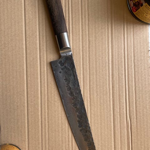 Het Izumi Ichiago Red Hawk Damascus-messer har en skærekern af japansk VG-10 Damascus-stål. Sidelagen (i alt 71 lag) er lavet af rustfrit stål.