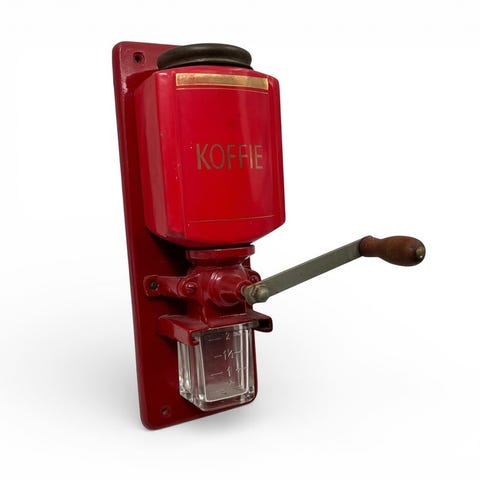 Det porcelænsreservoir, den tydelige typografi og det grafiske mønster giver denne kaffemølle en karakteristisk udstråling, som er yderst værdsat af samlere og interiørstylister. Velegnet som dekorativt vægobjekt, og muligvis også funktionel; funktionen er ikke testet.